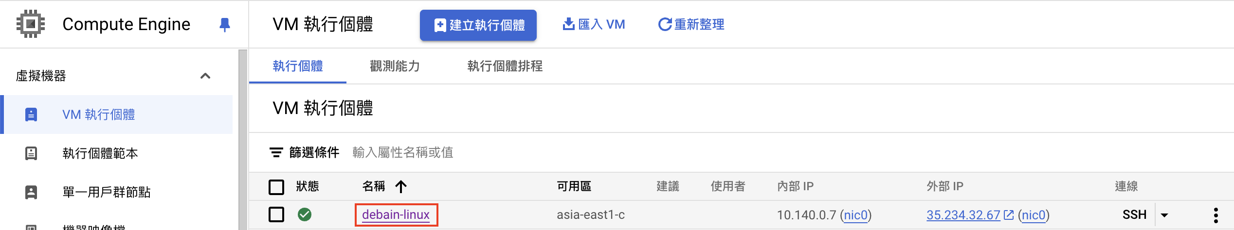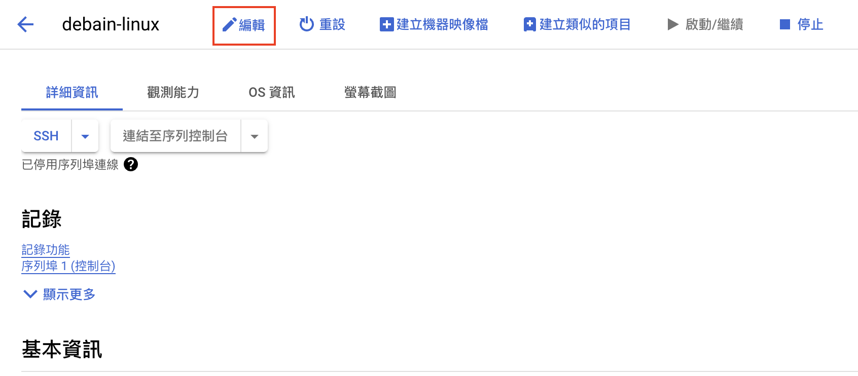 Google Cloud Console/Compute Engine/VM執行個體下點選你的VM