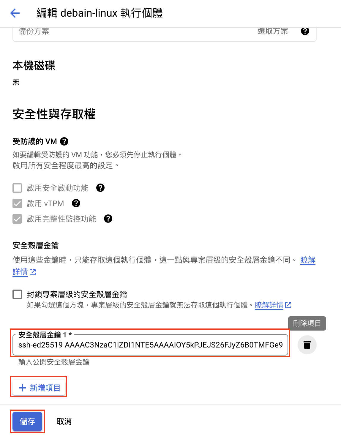 安全性與存取權/安全殼層金鑰點選+新增項目並輸入id_ed25519.pub,最後儲存。