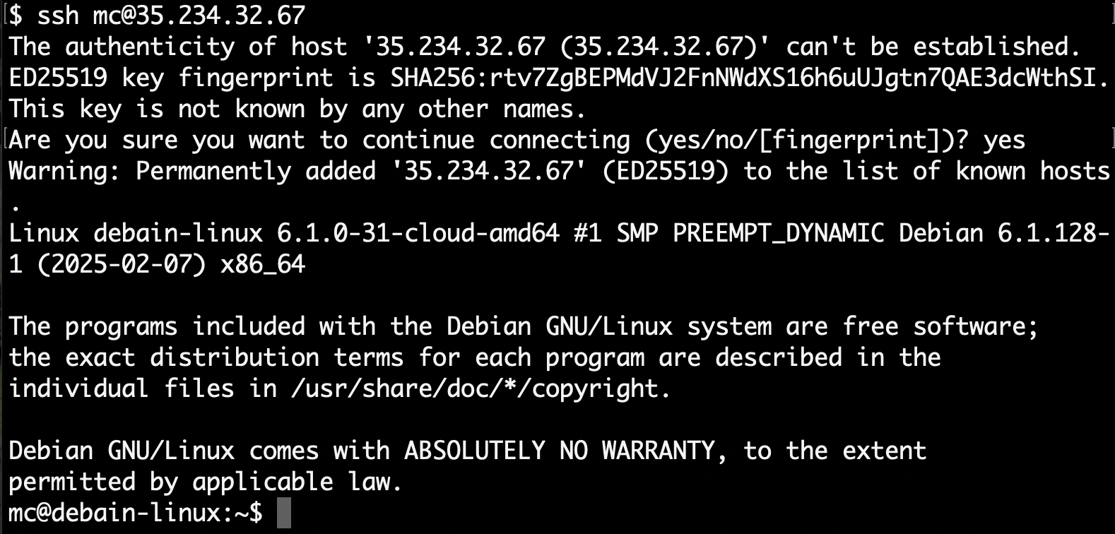 ssh your_username@your_gcp_IP即可遠端登入gcp(首次登入會在.ssh中建立清單known_hosts)